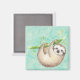 An adorable watercolor graphic features smiling sloth hangs from a branch on aqua and gold dot background