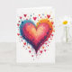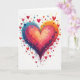 This greeting card features a large heart centered on a white background, painted with a smooth blend of rainbow colors. The shades shift from deep blue and purple on one side into pink, orange, and yellow on the other, creating a sense of movement and warmth. Around the main heart, many smaller hearts appear in different sizes, as if love is spreading outward in every direction. Visible brush strokes, soft paint drips, and gentle splatters along the edges add texture and energy to the artwork. There is no printed message on the front, allowing the colorful heart design to speak for itself. With its bright colors and expressive details, this card is a beautiful choice for sharing love, friendship, or heartfelt Valentine’s Day feelings with someone special.