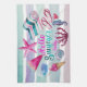 Create your own watercolor-inspired summer gift with this design featuring a starfish, beach mat, beach sandals, heart, seahorse, coral, seashell, ice cream cone and watermelon slice in tones of pink, turquoise, purple and teal over matching striped background. Replace the sample text with your own for personalized gift. Perfect for summer events, birthday, beach party, housewarming and other occasions.