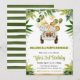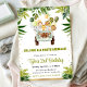 Elegant Watercolor jungle animal friends design with lion, tiger, monkey, elephant, giraffe and zebra as well as green tropical foliage with gold confetti and stripes background