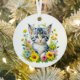 Personalized Christmas ornament. Ai art depicting a cute little grey striped tabby cat kitten sitting in a bunch of pretty yellow, pink and blue flowers.
