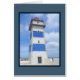 Nautical themed design with watercolor lighthouse decoration in dark blue frame. It is possible to change the background colour and to add different one to the design with your choice.