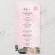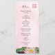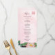 This modern Chinese wedding menu card features a watercolor lotus flower on a pink watercolor background and a pink double happiness symbol on a cream background. With custom bride and groom names, the wedding date and a custom menu text. On the backside are the initials to change.