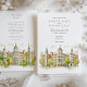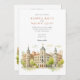 Celebrate your special day with this exquisite wedding invitation, showcasing the iconic architecture of Madrid, Spain. The front presents a picturesque view of the city, with its elegant buildings, domes, and towers, rendered in a soft, artistic watercolor style. Lush greenery frames the scene, adding a touch of natural beauty.