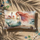 This dreamy watercolor artwork captures a serene mermaid resting on a sun-warmed shore, her iridescent tail blending seamlessly into the ocean’s gentle hues. With her flowing red hair catching the breeze and a tranquil lighthouse glowing in the distance, the scene evokes a sense of quiet magic and coastal nostalgia. The palette flows through soft seafoam greens, blush corals, and sandy neutrals, creating an aesthetic that's both whimsical and peaceful. Seashells, starfish, and foamy waves add charming seaside touches, while the painterly style enhances the ethereal, cottagecore vibe. Perfect for lovers of coastal daydreams, folklore, and gentle ocean scenes. AI generated artwork.
