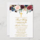 Elegant Watercolor Floral First Holy Communion Invitation includes burgundy roses, pink roses, red flowers, blue flowers, eucalyptus leaves and botanical greenery. Gold Cross.