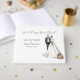 Beautiful watercolor illustration of newlyweds with champagne and a bouquet of flowers. Simple and elegant