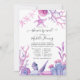 Whimsical pink and blue ocean themed long distance baby shower by mail invitation featuring sea ferns, seaweed, coral, shells and starfish.