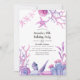 Whimsical pink and blue ocean themed birthday party invitations featuring sea ferns, seaweed, coral, shells and starfish designed to be quickly and easily customized to your event specifics.