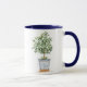 Coffee mug featuring a watercolor illustration of an olive tree with lush olive branches scattered throughout image. The tree is set in a blue and white planter. Image printed on both sides. Additional sizes and rim and handle sizes available.