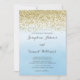 Wedding invitation with faux gold glitter design and watercolor ombre blue background.