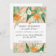 OEuvre d'aquarelle d'oranges de Cutie, fleurs de fleurs, fruits de bébé, agrumes et feuilles d'eucalyptus pour "Un petit garçon de Cutie, une fille ou sexe douche neutre ou saupoudrer l'invitation. Reverse side a typographie texte, "un peu mignon est en chemin. ," et une autre cutie orange et feuillage. L'arrière - plan d'abricot pâle définit le texte de l'invitation, qui peut être modifié à l'aide des champs modèle. Oeuvre d'Audrey Jeanne Roberts, artiste et designer de renommée internationale, copyright.