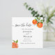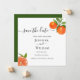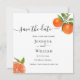 Elegant Save the date card featuring watercolor orange citrus illustration. Perfect for Summer weddings.
