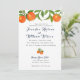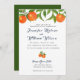 Elegant Orange citrus fruit watercolor invitations, great for summer weddings. Invitation feature watercolor illustrations of orange fruit and leaves with a navy blue border.