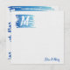 Blue and aqua watercolor paint smear with monogram on soft white texture for note card.