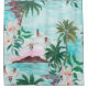 Watercolor painting seamless pattern with hawaiian landscape, palm tree, orchid flowers and flying flamingo birds
