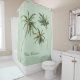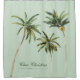 Our tropical themed shower curtain displays three watercolor palm trees against a light green colour taken from the palm leaves themselves. Elegant script typography spells out "Chez Christina" which is French for "at the home of Christina." Substitute your own name to create an upscale, unique look for your shower area. It's very easy to revise the text on the Personalization template. This design coordinates with a business card on which we've used the example business of tropical home decor accents... this shower curtain being one of the accent pieces, along with throw pillows, fleece blankets, duvet covers, and more.