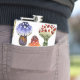 A whimsical pattern of various mushrooms in different shapes and colours. The mushrooms are illustrated with vibrant hues of red, blue, orange, and purple, featuring unique textures and polka dots on their caps.