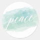 This small round sticker features a custom watercolor treatment in aqua and mint hues and a simply stated message of peace in an elegant script. Makes a great closure sticker or seal to dress up your envelopes this holiday season.