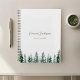 Custom-designed spiral planner featuring watercolor pine trees design with custom name and text on light grey colour background.