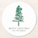 Modern Christmas party paper coasters featuring a simple design with my handpainted watercolor pine tree along with the editable greeting "Merry Christmas".