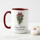 Modern Elegant Calligraphy Ink Script Watercolor Pines Winter Greenery with Burgundy Red Ribbon Bow Christmas Ornaments, Pine Cones and Holly Berries Happy Holidays Large Coffee Mug