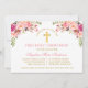 Elegant Watercolor Pink Blush Floral First Holy Communion Invitation includes pink roses and greenery leaves. Gold Cross.