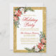 Elegant Watercolor Poinsettia Floral Red and Gold Script Holiday Party Invitation includes beautiful watercolor poinsettias, botanical greenery, winter foliage, holly berries, white roses, pine cones and blue berries. Gold Glitter Frame.