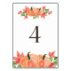 Table 4. Festive table numbers card featuring watercolor illustrations of pumpkins and maple leaves. This pumpkin table number is perfect for Thanksgiving and fall weddings, graduation, baby showers, bridal showers and other events.