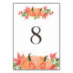 Table 8. Festive table numbers card featuring watercolor illustrations of pumpkins and maple leaves. This pumpkin table number is perfect for Thanksgiving and fall weddings, graduation, baby showers, bridal showers and other events.