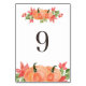Table 9. Festive table numbers card featuring watercolor illustrations of pumpkins and maple leaves. This pumpkin table number is perfect for Thanksgiving and fall weddings, graduation, baby showers, bridal showers and other events.