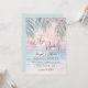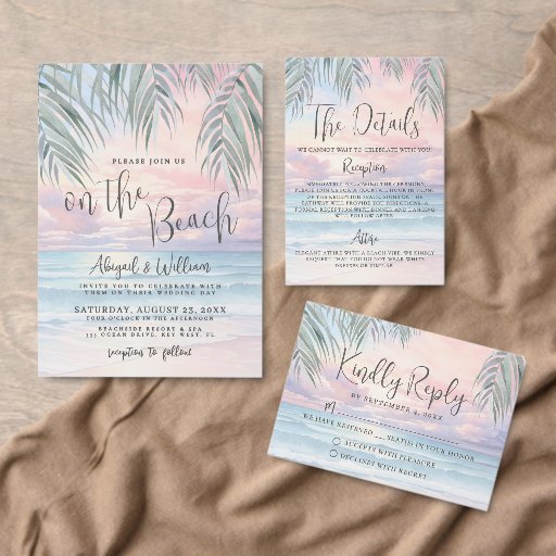 Simple Seaside Watercolor Summer On The Beach Wedding Invitation. The background blends a soft pink, purple, blue, and tan sunset sky that gently transitions into the ocean and sandy shoreline, with the beach set at a slight angle for a modern coastal feel. The artwork stays calm and slightly abstract as waves meet the sand, while palm leaves rest at the top above the horizon for a subtle tropical touch.