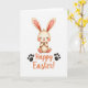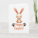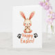 This card features a cute, upright rabbit centered on a white background, painted with soft, watercolor-like shading 🐰. The fur is creamy with warm brown touches that add depth, and the long ears curve upward with rosy pink on the inner sides, giving the face a gentle, affectionate look. Its eyes are closed into curved crescents with tiny lashes, like it’s smiling at someone close by, and the small red nose and slightly open mouth show a peek of tongue that feels friendly and sweet. Light pink blush on the cheeks and the neatly tucked front paws suggest a shy, tender pose, as if it’s holding back a happy greeting. The hind paws face forward with matching pink pads, adding extra softness to the stance 🐇. Beneath the rabbit, the words “Happy Easter!” sit centered in curving orange lettering, and the text is framed on both sides by two small, dark paw prints. The overall layout stays airy and uncluttered, with the orange message and paw prints sitting just below the rabbit’s feet. The paw prints appear as two dark marks placed left and right of the orange greeting near the bottom of the design.