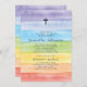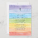 Composed of cursive script and serif typography; All against a backdrop of white background. A simple cross subtly decors watercolor rainbow.