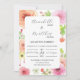Beautiful watercolor ranunculus flowers frame this wedding invitation. The flowers are orange and pink with some smaller more neutral-coloured flowers in white and pink. The text sits on a white rectangle with rounded corners to make it stand out from the floral design. All text is customizable for your event.