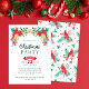 This Christmas Party design features a hand painted watercolor border of red cardinal birds, oranges, poinsettia flowers, holly and red berries, pine leaves and red florals. You can fully customise all the text to suit your event. On the back of the card is a pattern or red cardinal birds and Christmas winter greenery. See the whole matching collection.