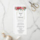 The design features an elegant watercolor floral wreath decorated with peonies, roses, eucalyptus greenery, and more in shades of red, green, and pink. The design also features a modern font and text layout. A matching floral arrangement is added to the back to carry over the overall theme. The natural palette makes it great for summer weddings, boho weddings, fall weddings, and rustic weddings.