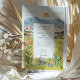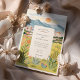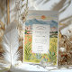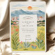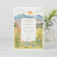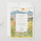 This elegant watercolor wedding invitation captures the warm beauty of Reno, Nevada with a scenic mountain backdrop and glowing desert sunset. The illustration features rolling peaks, the sun dipping behind the horizon, and softly coloured buildings nestled among nature. Wildflowers, succulents, cacti, and tall grasses frame the card in natural tones of green, golden yellow, blush pink, and warm coral. The peaceful colour palette and clean layout are ideal for couples planning a nature-inspired or western destination wedding. The reverse side continues the botanical theme and provides extra space for helpful event details.