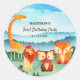 Cute Safari Animals Round Sticker with watercolor blue green forest background and jungle, zoo animals Giraffe, Lion, Bear, Fox. This sticker is also available in square and rectangle size in our store. Use personalize this template option to change the text | Use customize further option to change the text style, size and colour if required.