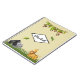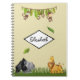 A personalized spiral notebook with a cool safari theme. Designed with a banner of jungle leaves at the top and mischievous monkeys hanging upside down. A hippo, gorilla, lion and giraffe hanging out on the bottom in some savannah grasses. Set on a tan background.
