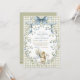 Charming watercolor baby squirrel with blue bow on soft sage green gingham background, framed by delicate forget-me-not florals and leafy wreath. Perfect gender-neutral invitation for a whimsical woodland or cottagecore baby shower. Fully customizable – edit text, colors & more!