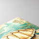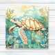A graceful watercolor sea turtle glides through an underwater world, its shell painted in warm earthy browns, tans, and burnt orange. Flowing strands of seaweed in rich teal, aqua, and blues sway gently around it, creating a serene ocean scene. The soft watercolor texture and calming palette make this piece both peaceful and captivating.