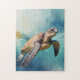 Watercolor picture of a close up of a sea turtle swimming in the ocean. Blues, tan, and white in the background