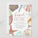 Cute summer beach picnic invitations feature a border of watercolor sea shells, starfish, and sea glass, including junonia, conch, sand dollar, auger, and clam. Personalize with your party details in the centre. Customize this versatile summer invitation for any occasion, like birthdays, house parties, or engagement celebrations.