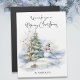 Sweet smiling snowman with pine tree and decorated bare tree.