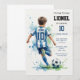 Kick off the celebration for your little soccer star! This personalized birthday party invitation features a beautiful watercolor illustration of a young player, perfect for an action-packed party. The artistic and modern design, with its cool blue and green splashes of color, will get everyone excited for game day. Easily customize all the details to invite friends and family to your son's big match. It's the perfect way to set the theme for a fun and memorable birthday!