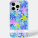 Customize this colorful watercolor starfish in blue, aqua, yellow and pink iPhone 15 pro max case with your your name in a trendy modern CAP font in pink on white. It's so modern and trendy!