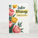 Designed with an off-white background, this card features a lush border of spring flowers and leafy stems curling along the left side and across the bottom 🌷. Sunny yellow and soft coral-pink tulips sit among deep green leaves, their gently shaded petals giving the scene a tender, just-picked look. The open space to the right feels like a quiet pause where the bouquet seems to lean in, as if sharing a close moment with the reader 🐰. In the upper-right area, the words “Easter Blessings” appear in dark green lettering, set over a wide, paint-like yellow brush stroke that makes the message stand out. Just beneath it, “Daughter & Son-in-law” is placed on a second yellow stroke, aligned with the first for a balanced layout. Soft light and subtle color shifts across the petals add depth, while the background stays lightly textured and uncluttered. At the bottom edge, a fully opened coral bloom shows tiny golden stamens at its center, framed by layered petals and dark green stems.