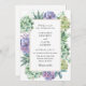 Wedding invitation featuring watercolor succulents in shades of green and purple surrounding a gold frame. Personalize with your information or click "Click to customize further" to edit font styles, size and colours.