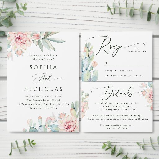 Watercolor succulents wedding. Pink floral cactus Invitation
